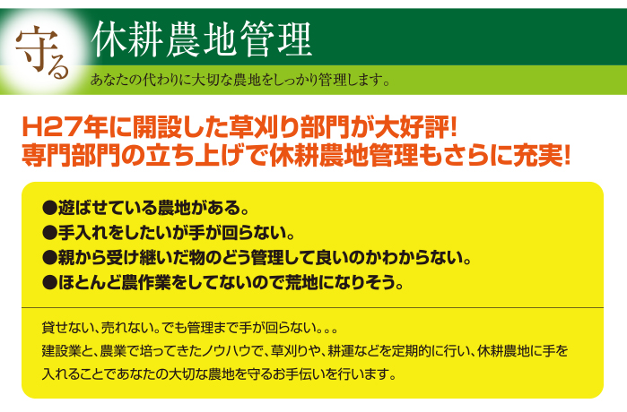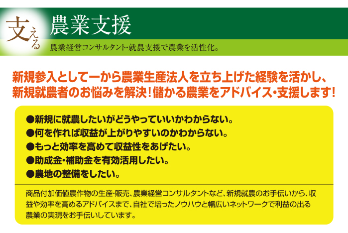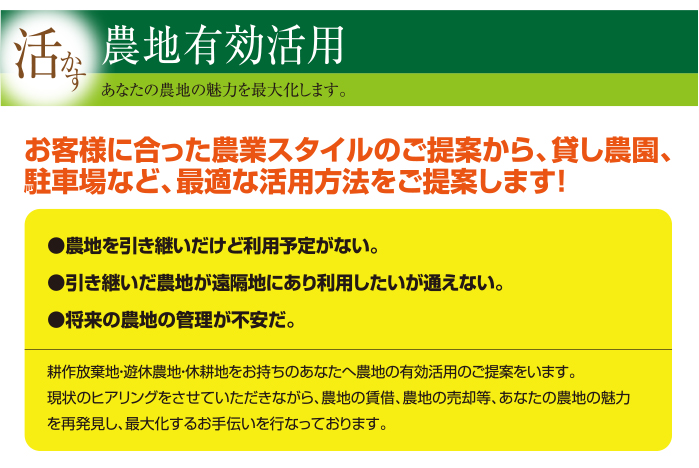 農地管理、農地情報の集積(農地台帳の作成)、農地の流動化(マッチング)、商品付加価値農作物の生産・販売、農業経営コンサルタントなどを行い、農地の本来の価値を取り戻すお手伝いをしています。