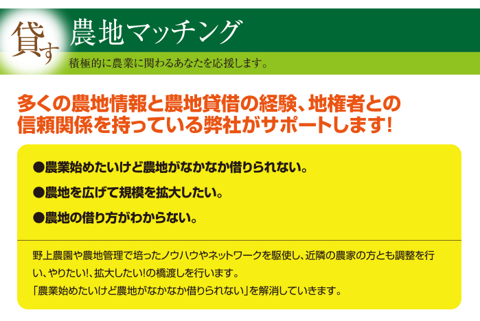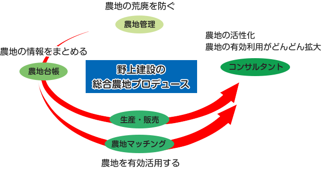 野上建設では、建設業で培ってきたノウハウとつながり、また、グループ会社の野上農園で培ってきた農業のノウハウとつながりを活用し、農地の有効活用。